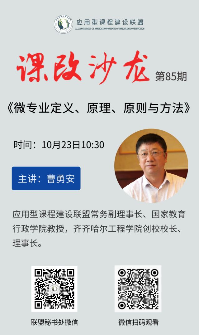 由应用型课程建设联盟发起的《微专业定义、原理、原则与方法》讲座将在10月23日举行,具体安排详见图片,请教学院长、微专业负责人及时收看学习。也欢迎其他专业负责人、教研室主任和教学秘书参加。